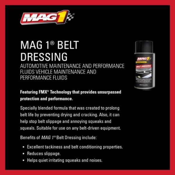 Specially blended formula that was created to prolong belt life by preventing drying and cracking. Also, it can help stop belt slippage and annoying squeaks and squeals. Suitable for use on any belt-driven equipment.